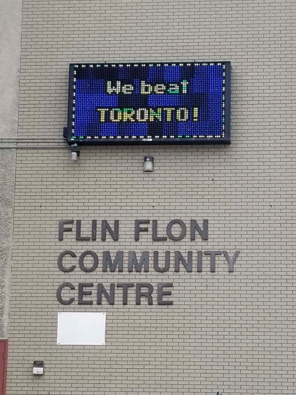 Flin Flon celebrated its achievement by posting a “We beat Toronto” message on the local community centre’s electronic message board outside of the building.