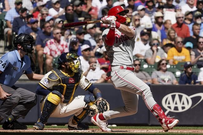 Harper, Phils hit 6 HRs, Wheeler shuts down Brewers 12-0