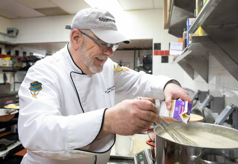 Mike Publicover prepares soup for his customers. Chicken noodle soup is a given every Monday, and there’s a weekly taco bar.