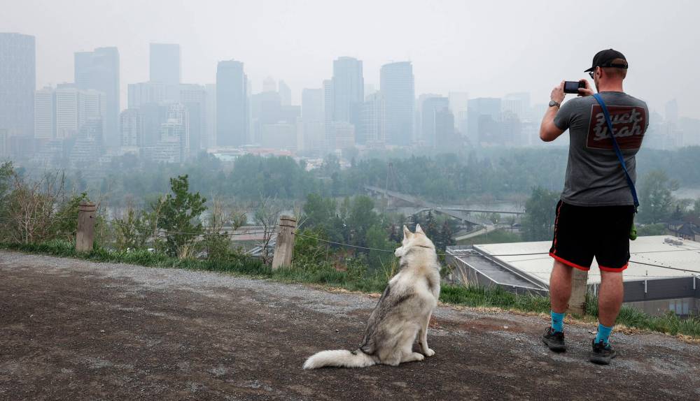 Jeff McIntosh / The Canadian Press Files Thick smoke from wildfires blankets Calgary’s downtown in May.