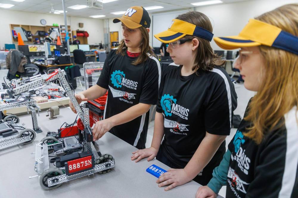 MIKE DEAL / FREE PRESS Gold team members (from left) Zajac St. Godard, Tennyson Janke and Hannah Klassen, work on their robot.