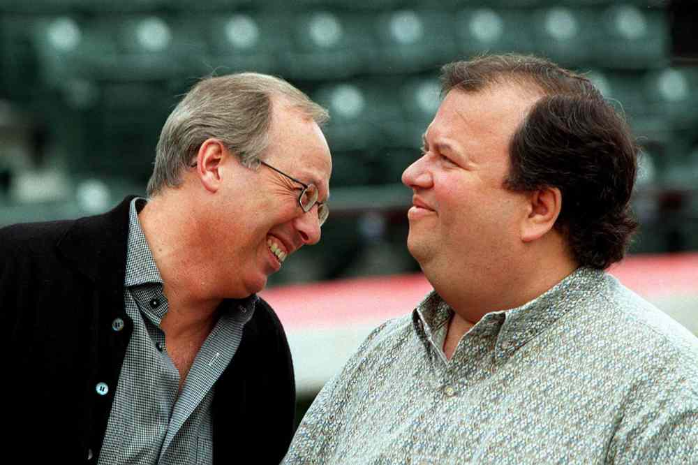 Sam Katz (left) has a private laugh with Sandy Shindleman of Shindico in 1999.