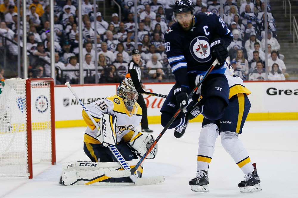 But then the puck dropped and the life was sucked out of the arena. Mike Fisher opened the scoring 4:53 into the game, poking in a loose puck that squeezed through Hellebuyck’s five-hole. P.K. Subban made it 2-0 at 10:06 with a power play blast that also went right through Hellebuyck, and Austin Watson scored at 17:05 for a 3-0 lead.