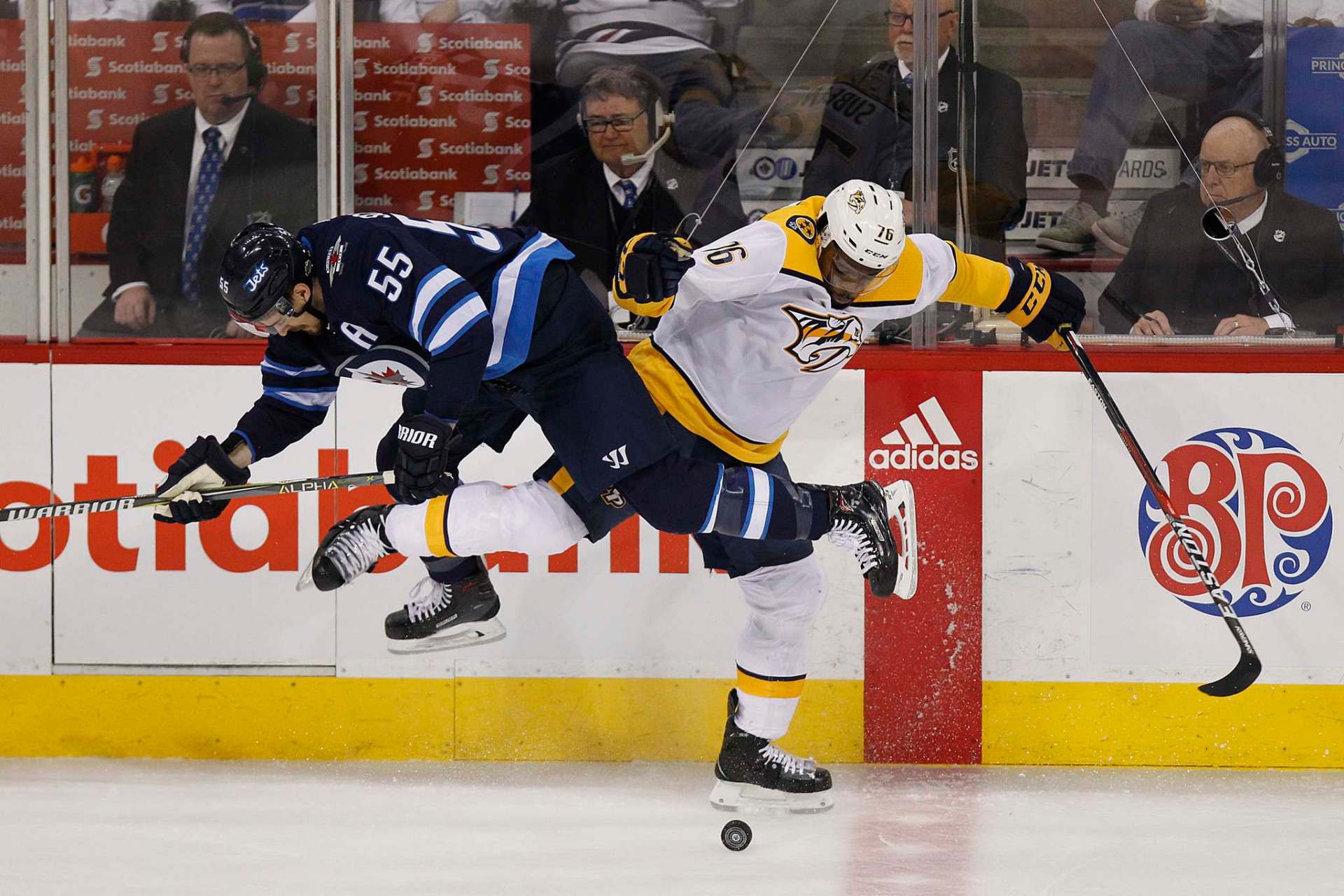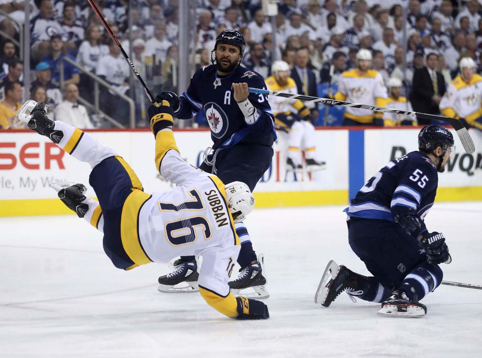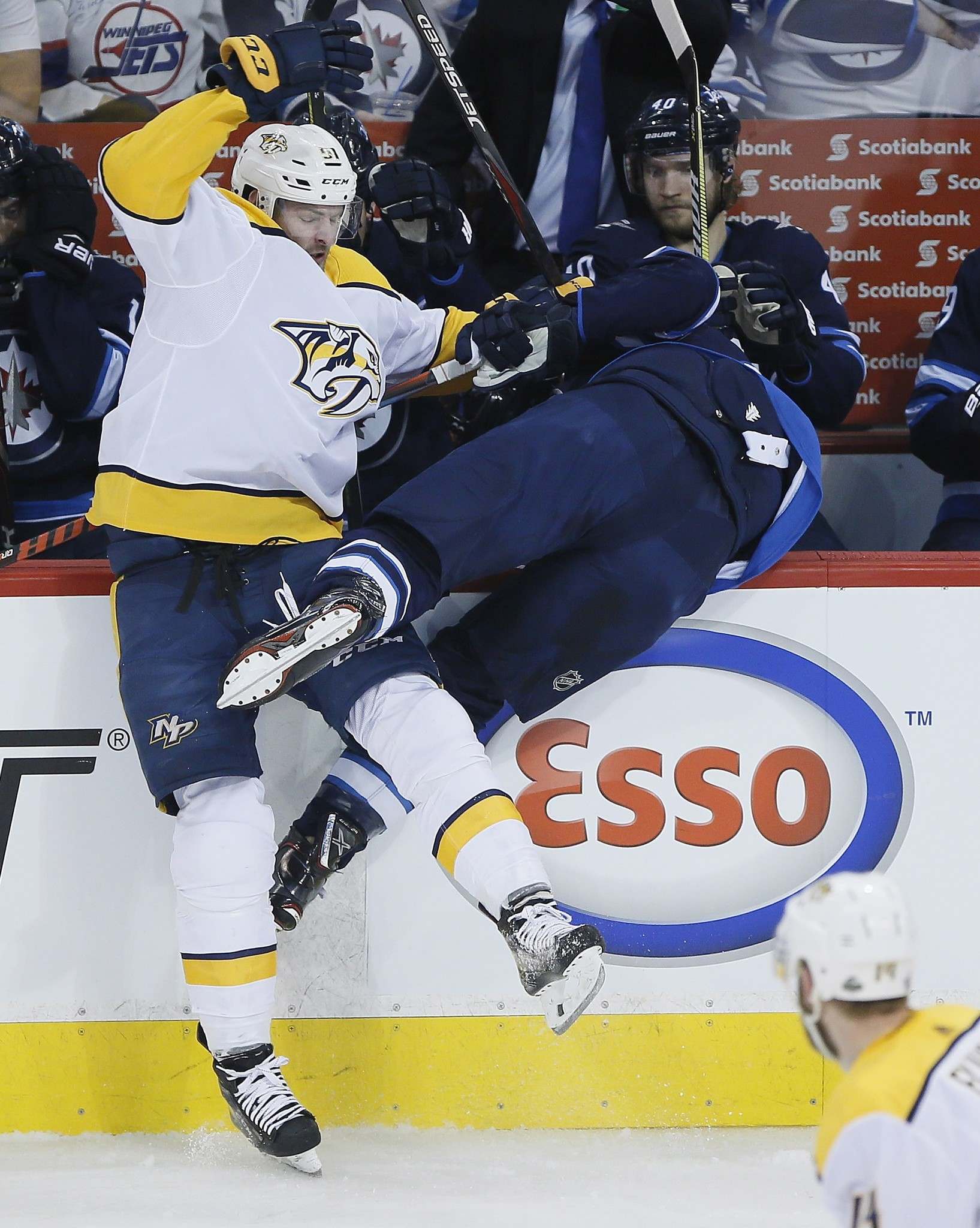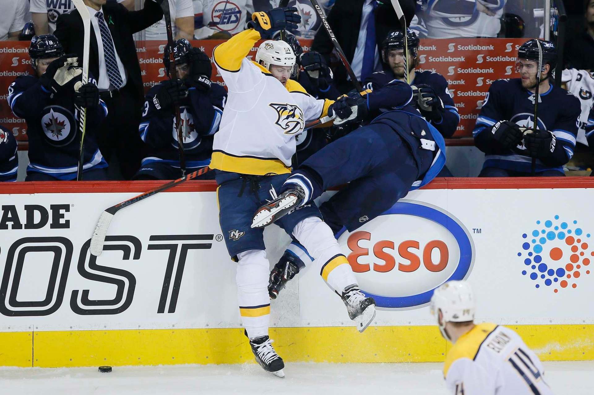 THE CANADIAN PRESS/John Woods Winnipeg Jets' Blake Wheeler is checked into his bench by Nashville Predators' Austin Watson during first period NHL round-two game four playoff action in Winnipeg on Thursday.