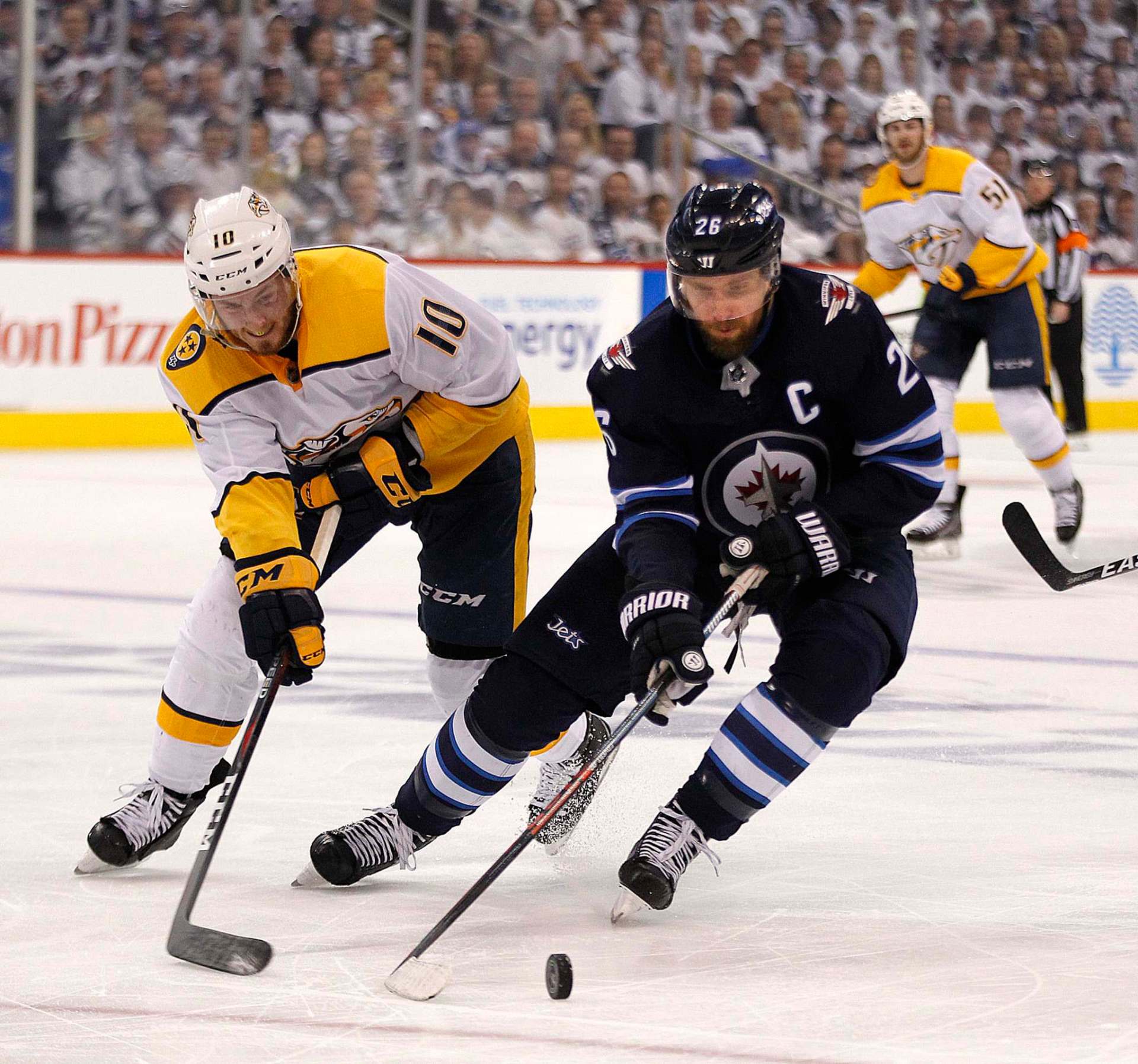 The game began to open up a bit with the teams trading chances, but that came to a halt when Byfuglien was whistled for a slashing penalty which gave Nashville their first power play of the game.