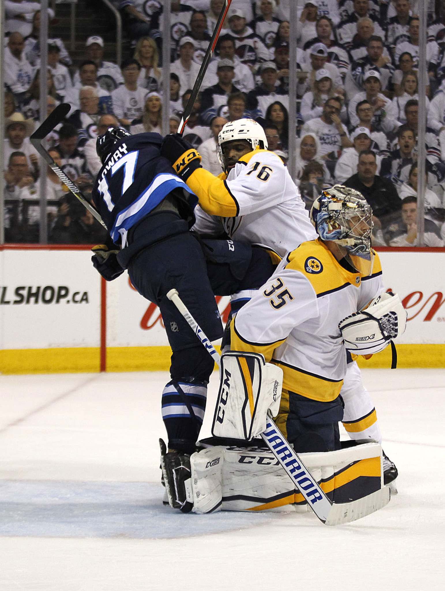 THE CANADIAN PRESS/John Woods Winnipeg Jets' Paul Stastny's (25) shot is stopped by Nashville Predators goaltender Pekka Rinne (35) as Scott Hartnell (17) defends during first period NHL round-two game four playoff action in Winnipeg on Thursday, May 3, 2018.