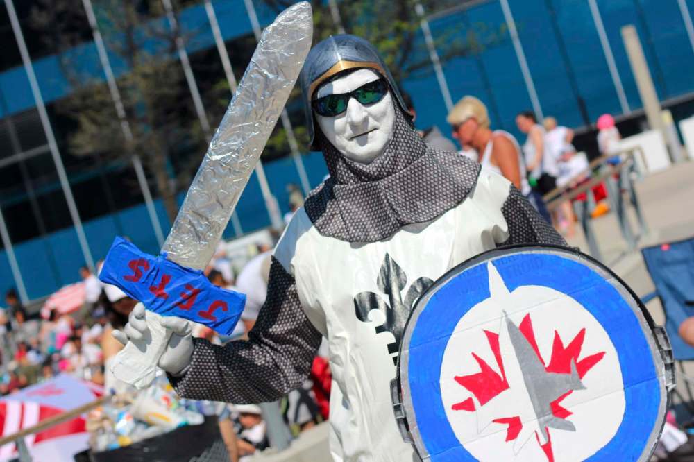 Cam Scott was still smiling post-defeat, his reddish lipstick adding flair. Scott dressed as Queen Elizabeth II in an homage to her giant portrait, which used to hang in the Winnipeg Arena. He posed for countless photos with Jets fans.
