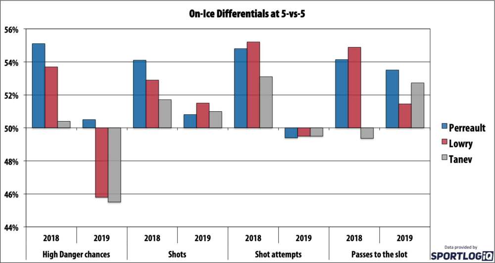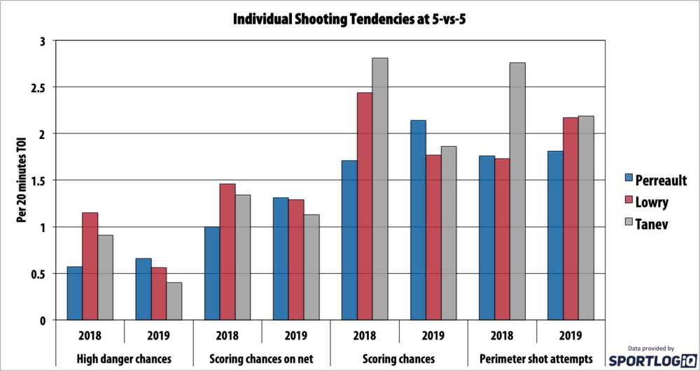 In 2018, Perreault and Lowry were the two Jets with the best high-danger scoring chance differentials on the team, and their puck possession dominance held through shots and shot attempts, while Tanev was closer to average in high-danger chances but strong on shots and shot attempts.