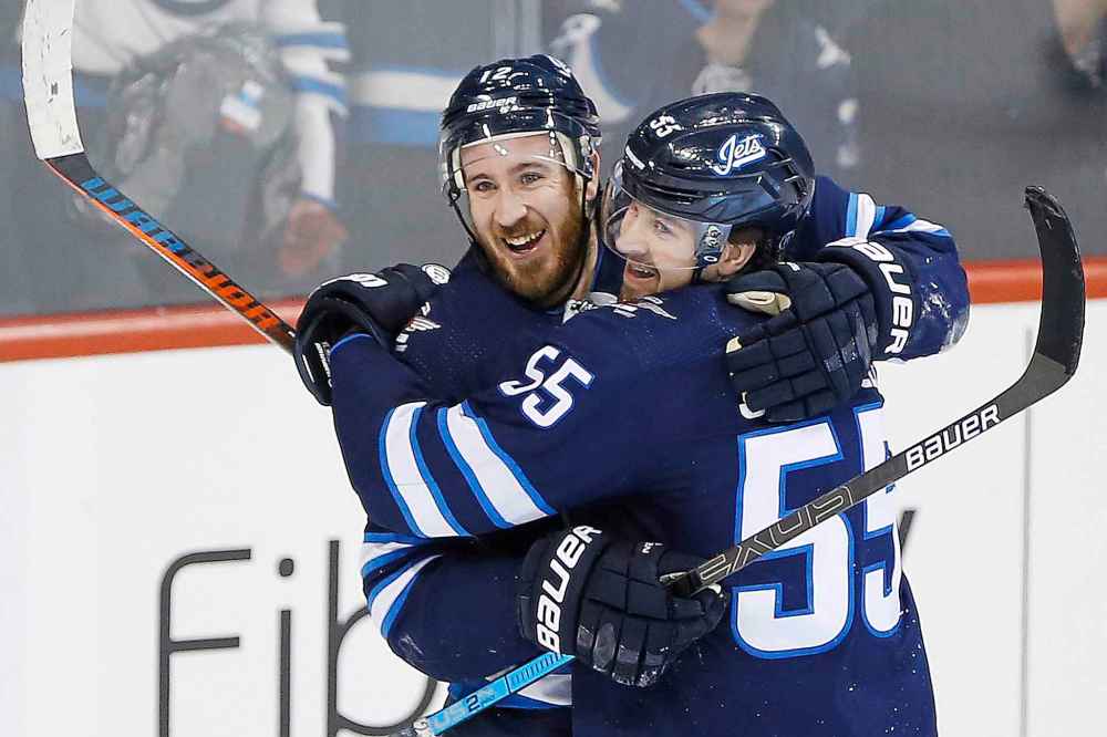 Kevin Hayes (left) and Mark Scheifele celebrate Hayes' first goal as a Jet when he scored into an empty net late in the third period. (John Woods / The Canadian Press)