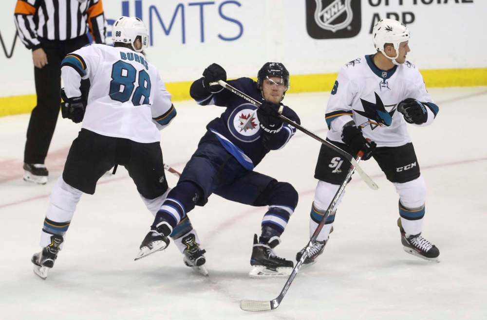 Winnipeg Jets' Nikolaj Ehlers gets tripped up between San Jose Sharks' Brent Burns, left, and Michael Haley Tuesday in Winnipeg. Ehlers admitted he made a mistake in the dying seconds of a tied game that allowed the Sharks to score the game-winnipeg goal with less than 4 seconds remaining on the clock.
