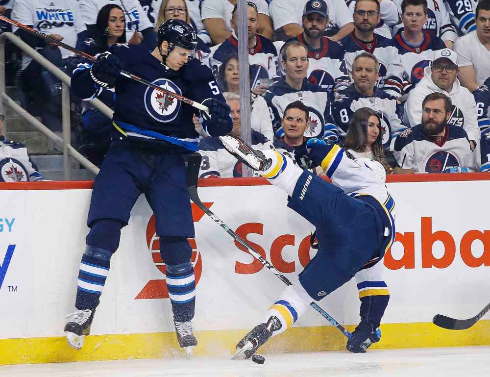 Winnipeg’s biggest bodies also used their stature to pound the Blues along the wall. Blue-liners Dustin Byfuglien, Tyler Myers and Ben Chiarot all unloaded heavy bodychecks in the opening 20 minutes, and the hosts led 36-21 in the hit department by the final whistle.