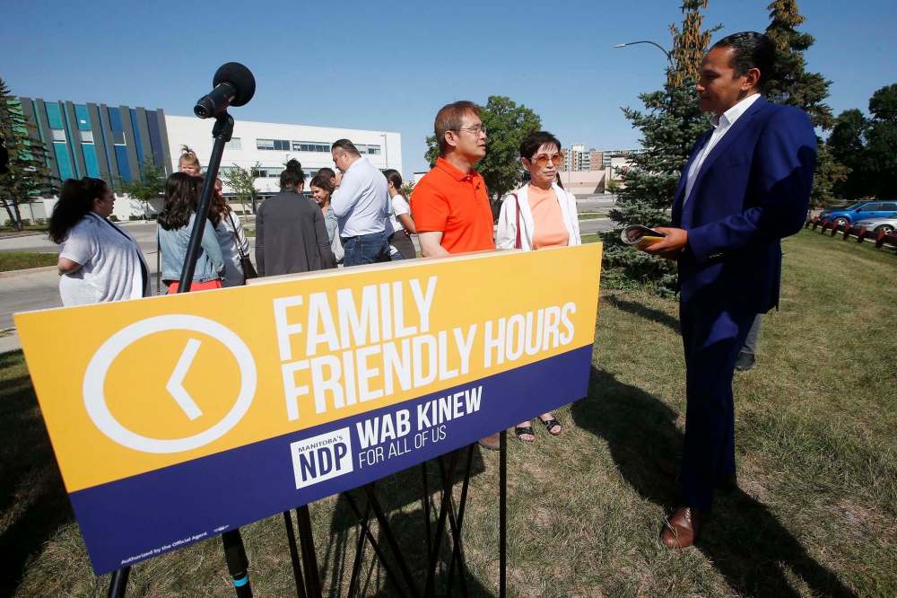 Kinew, standing near the Access Fort Garry centre, said it is never open on Sundays, but if elected, his government would open it that day as a pilot project.