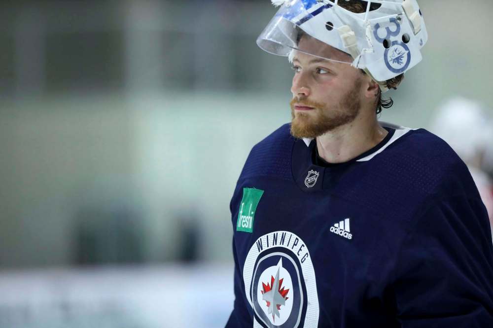 Jets Goalie Laurent Brossoit, during practic at Bell MTS Iceplex Wednesday.