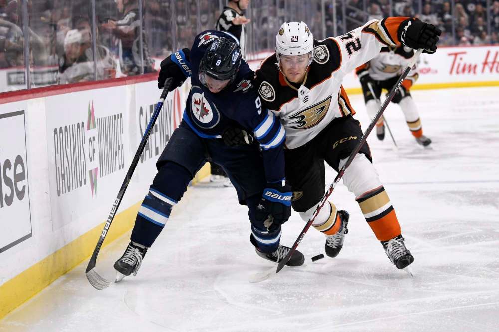 Winnipeg Jets' Andrew Copp and Anaheim Ducks' Carter Rowney battle along the boards for the puck on Sunday.