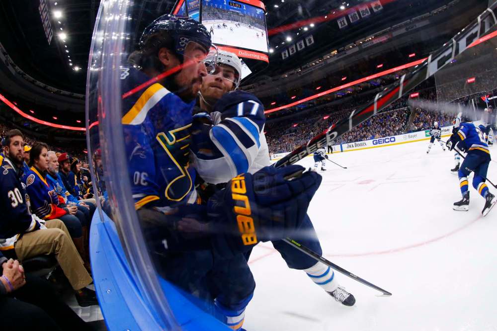 Then it came undone in the blink of an eye. Josh Morrissey, Jack Roslovic, Blake Wheeler and Nikolaj Ehlers all headed for the bench at the same time, having just dumped the puck in on St. Louis goalie Jordan Binnington.