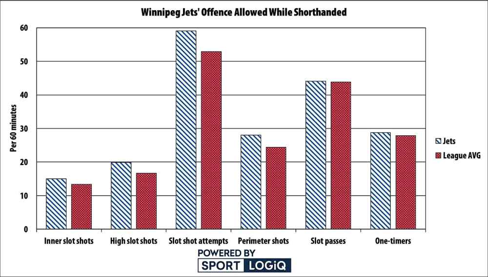 At even-strength you want your players to move the puck with control, avoid dumping it off the glass and out as much as possible to maintain possession, but while short-handed when you can’t ice the puck, it’s a viable option a lot more often. However the Jets are successful on only 69.2 per cent of their attempted dump-outs while down a man, the second-worst mark in the league, which often means they’re not just failing to relieve pressure, but also often out of position after attempting the clearance, and tired as well.