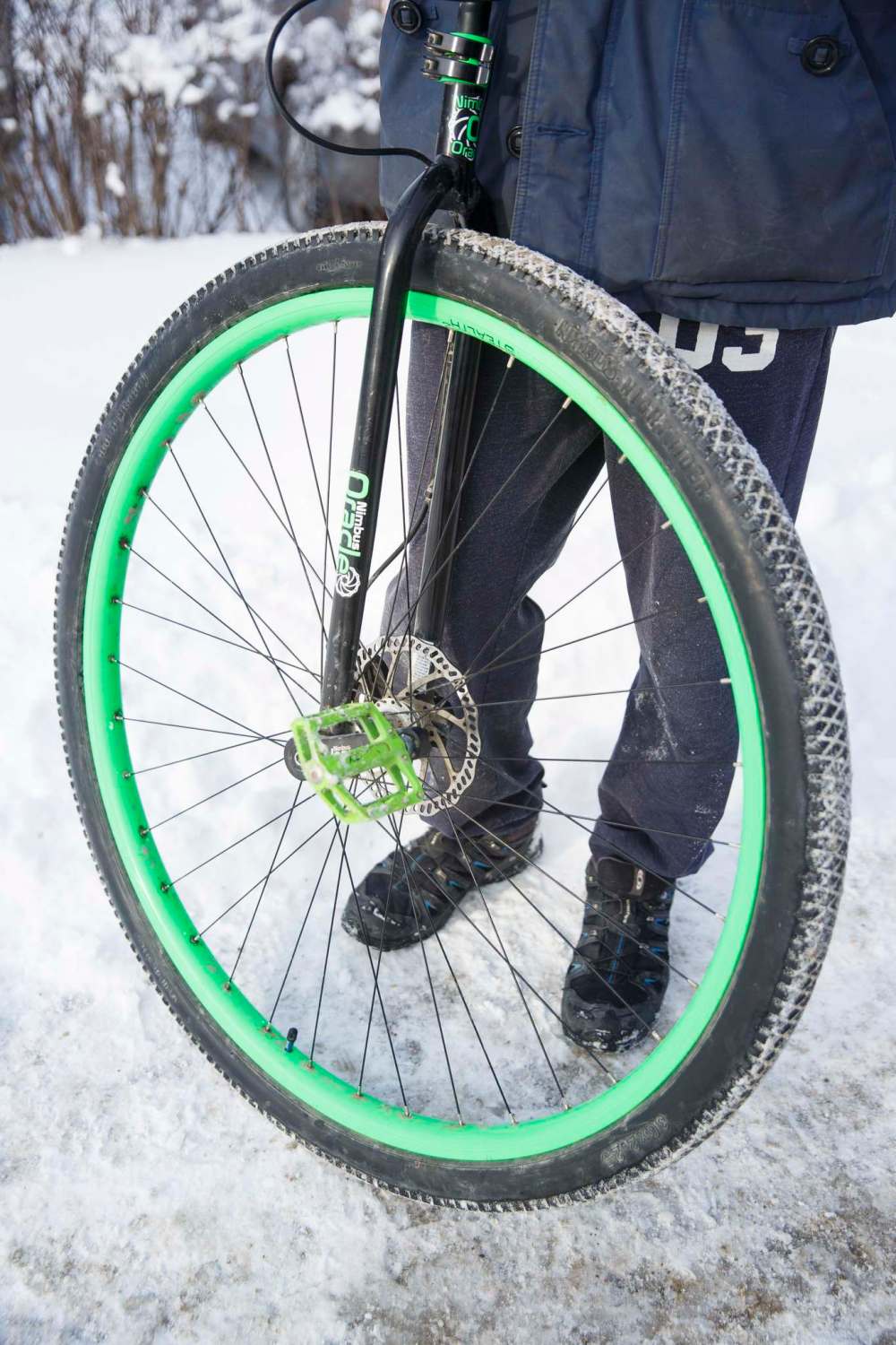 For one thing, he’s deceptively gangly, standing six-foot-three, often towering over the people he meets. And then, there’s that thing he’s sitting on to get to work every winter morning: a 36-inch high unicycle, decked out in neon green decals, in case you weren’t already staring. He wants you to stare. He dares you to smile. He loves your attention.