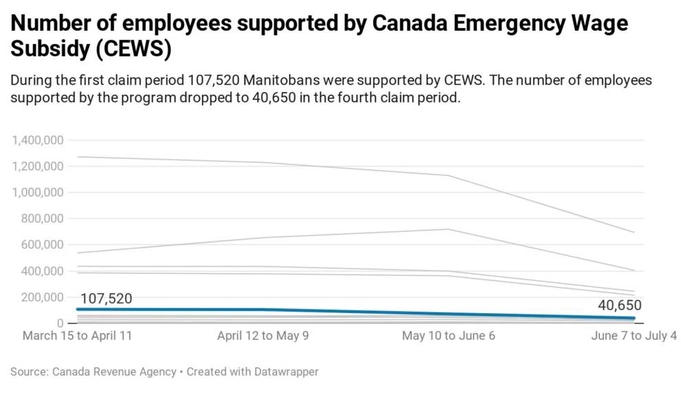 Manitobans accessing federal emergency funds in July fell by two thirds from the peak of the pandemic lockdown thanks to tighter criteria, the province’s quick recovery and the “good old Manitoba economy.”
