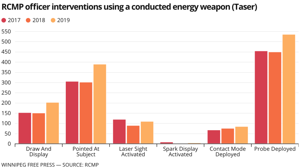 Internal use-of-force statistics obtained by the Free Press show Manitoba officers deployed Tasers 154 times between 2017 and 2019, a three-year stretch in which police firearm use steadily declined.