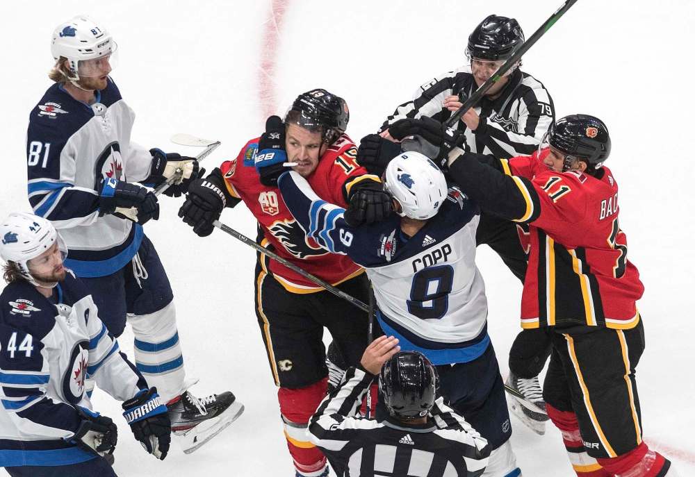 Jason Franson / The Canadian Press Winnipeg Jets' Andrew Copp (9) and Calgary Flames' Matthew Tkachuk (19) rough it up during third period NHL qualifying round game action in Edmonton, on Monday August 3, 2020.