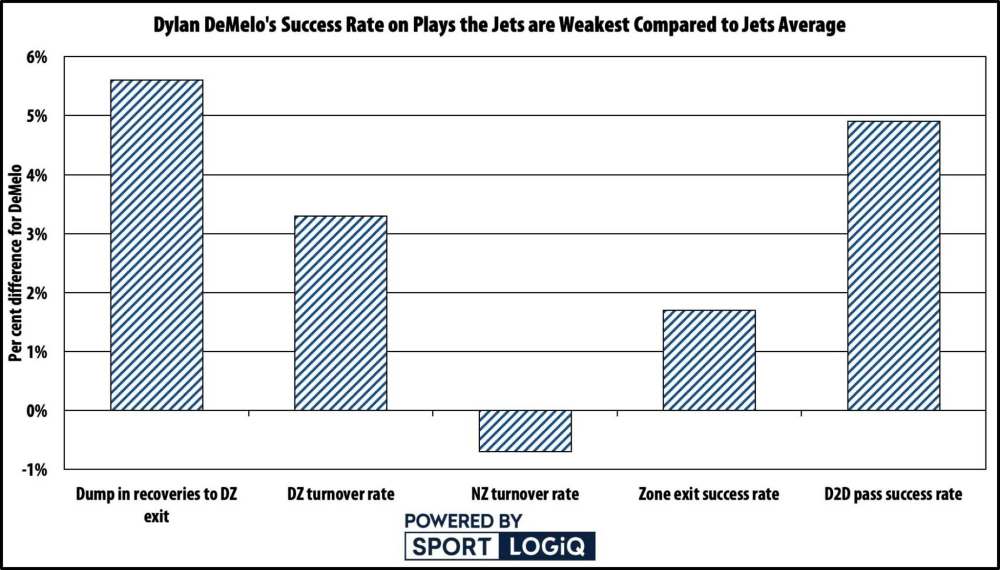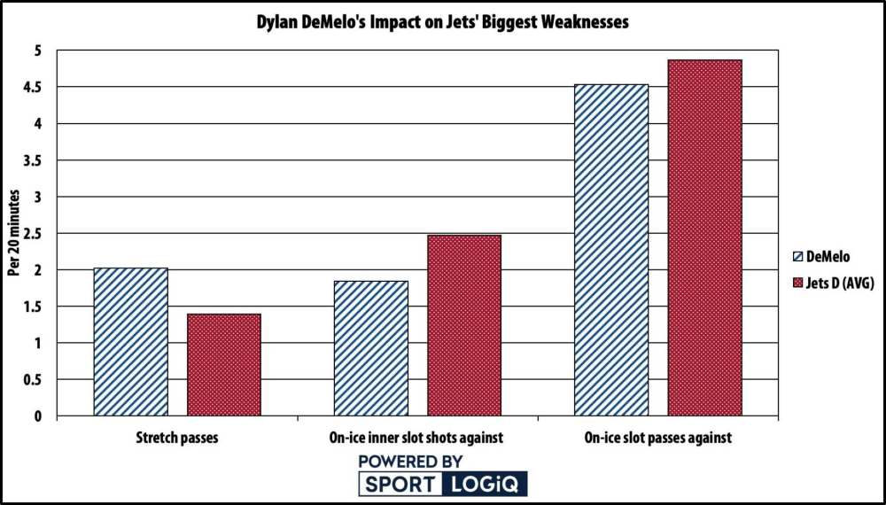 DeMelo doesn’t have as strong of an impact on slot passes against, but the Jets do move from the equivalent of a last-place team to a 26th-place team in allowing those while he’s on the ice, which is still a positive.