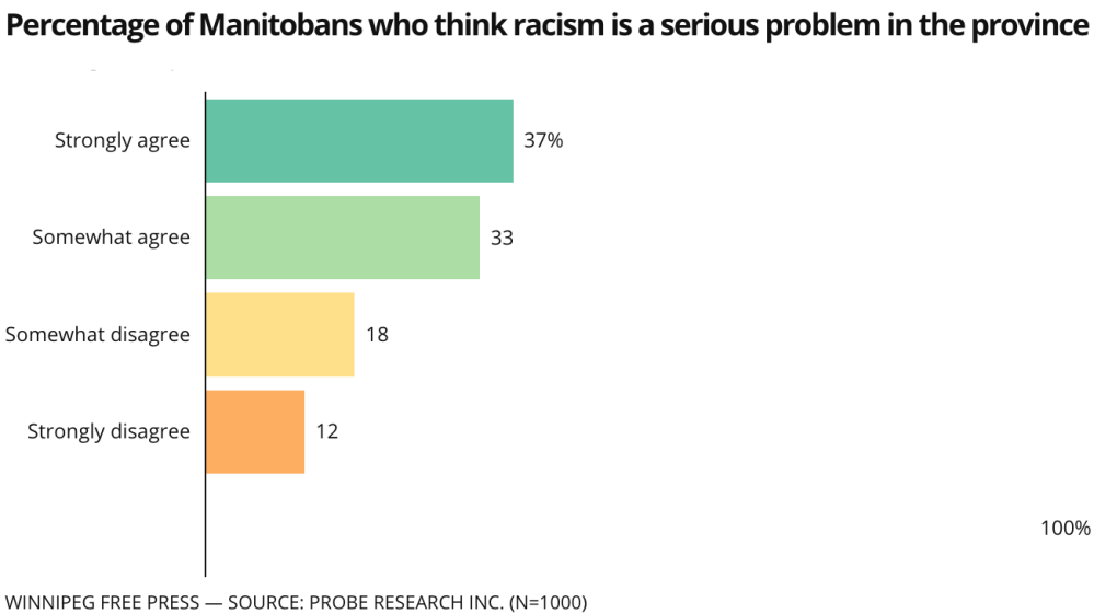 Overall, 70 per cent of Manitobans agree racism is a serious problem in the province, and overwhelmingly, eight-in-10 Manitobans say the division between Indigenous and non-Indigenous peoples in Winnipeg is a serious issue.