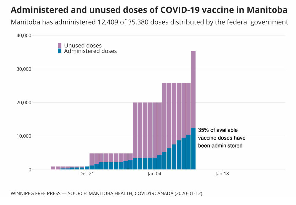 Manitoba has been among the slowest to use the doses it has received, and most provinces had an underwhelming start, in part, because vaccines arrived weeks before Ottawa had told them to prepare for it.