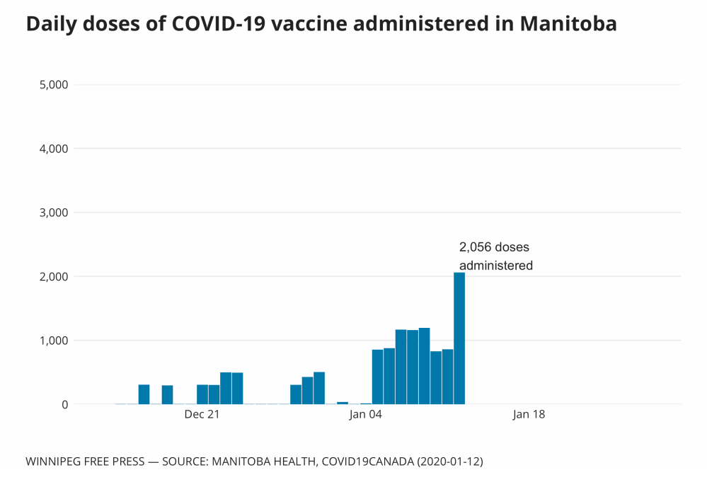 As of Wednesday, the province reported 12,409 doses of COVID-19 vaccine have been given in Manitoba, including 10,749 first shots and 1,660 boosters.