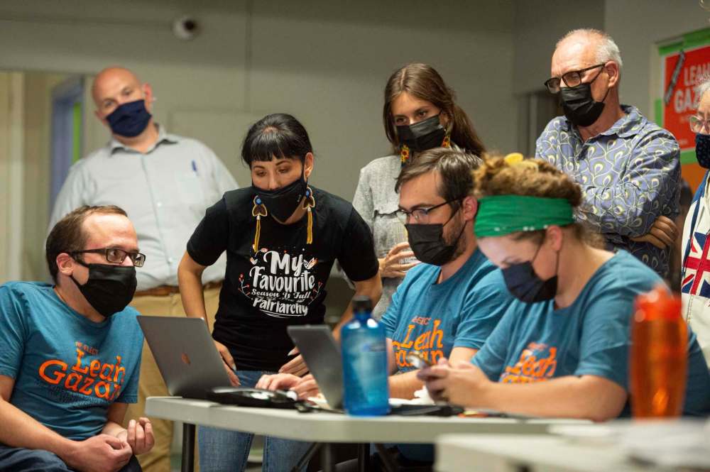 Leah Gazan, centre, and party supporters watch election results come in last night.