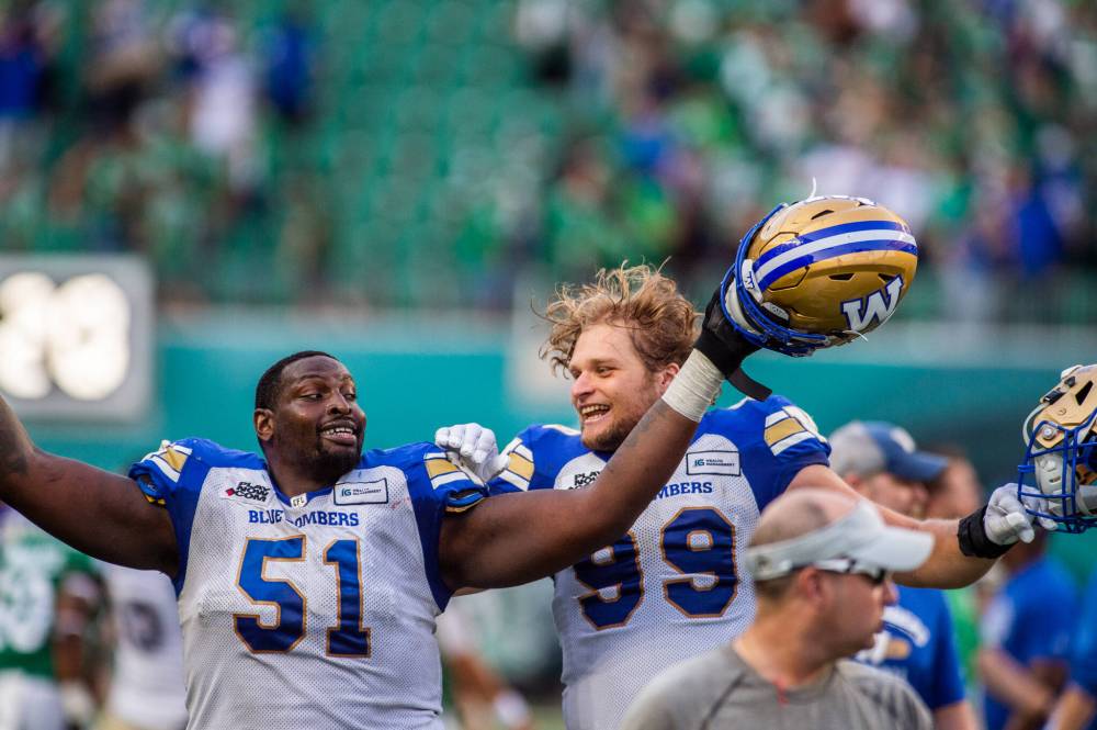 Winnipeg Blue Bombers offensive lineman Jermarcus Hardrick (51) and defensive tackle Cameron Lawson (99) celebrate after defeating the Saskatchewan Roughriders in the annual Labour Day Classic 20-18 in Regina on Sunday.
