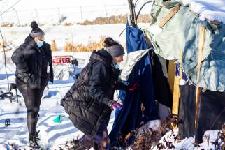 MIKAELA MACKENZIE / WINNIPEG FREE PRESS Case worker Robin Eastman checks to see if anyone is around at a camp to offer sandwiches, warm socks, water, and other supplies from the Main Street Project van in Winnipeg.