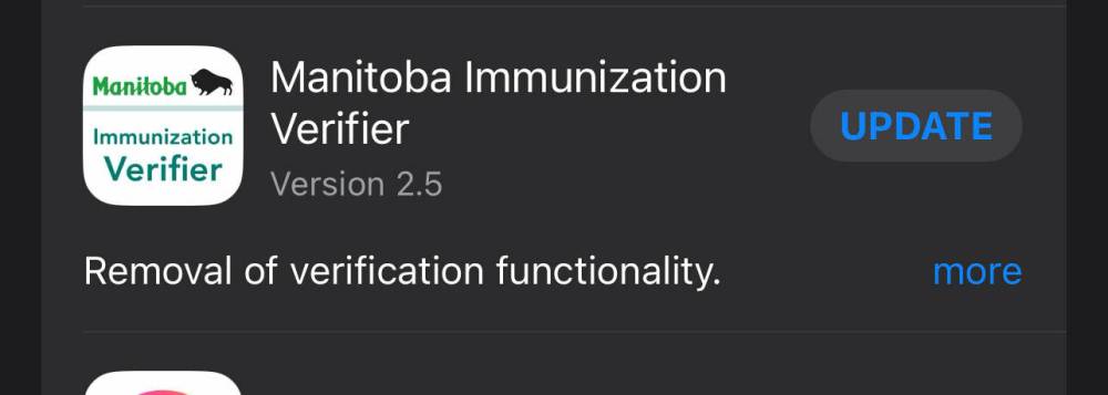 The latest update to the Manitoba Immunization Verifier app states the verification functionality has been removed. (Screenshot)