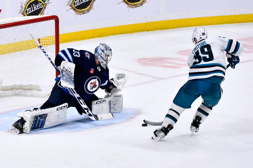 San Jose’s Logan Couture scores the overtime winner against Jets goaltender David Rittich Monday night at Canada Life Centre.