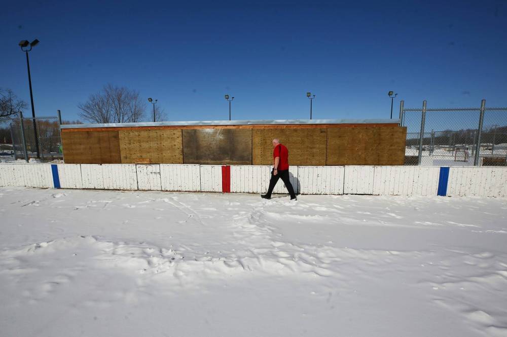 Barry Chambers, a volunteer at Sturgeon Community Centre, inspects the boards covering the players benches. The centre has been boarding up the benches and only taking them down just before scheduled games as a way to reduce excessive maintenance costs.