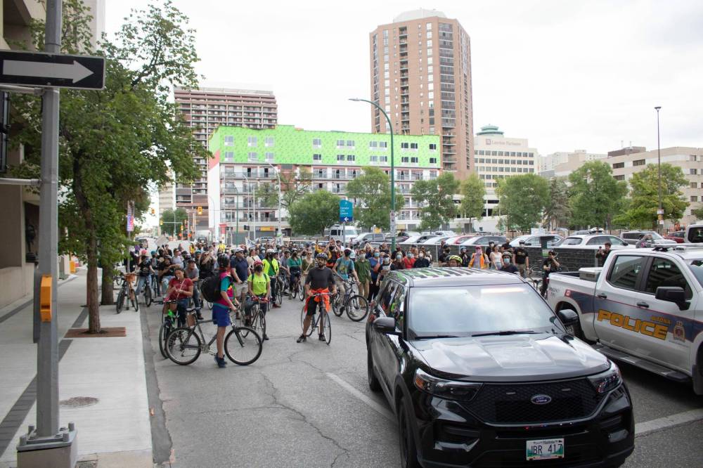 A group of protesters, organized by Winnipeg Police Cause Harm and Critical Mass, gathered outside the RBC Convention Centre to protest the World Police and Fire Games.