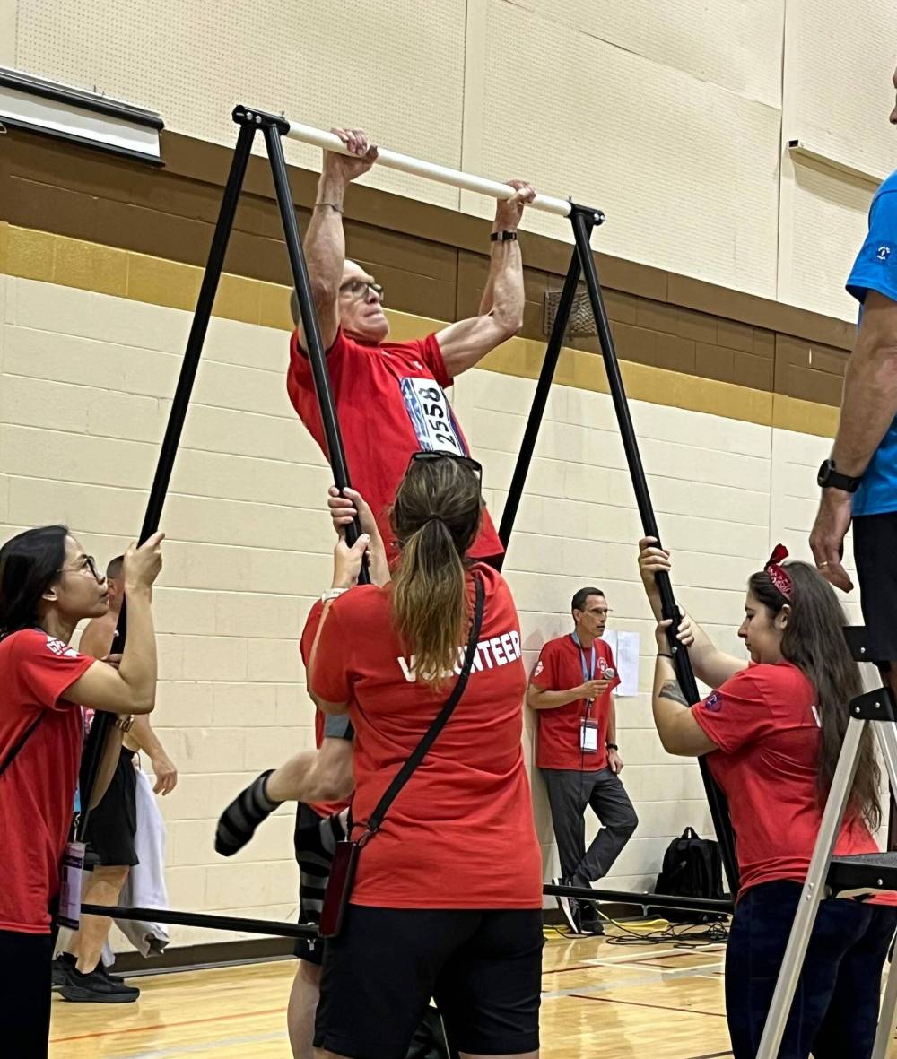 SUPPLIED Ray Steen, 74, doing pull ups during the Toughest Competitor Alive event at the World Police and Fire Games, held at the University of Manitoba.