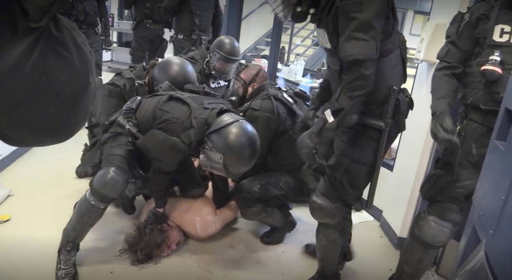 Ahmo, brandishing a broken mop handle, advanced on the officers, who forcefully took him to the floor. Ahmo screamed and flailed as a half-dozen officers piled on top of him, forcing the inmate’s face and neck to the floor.