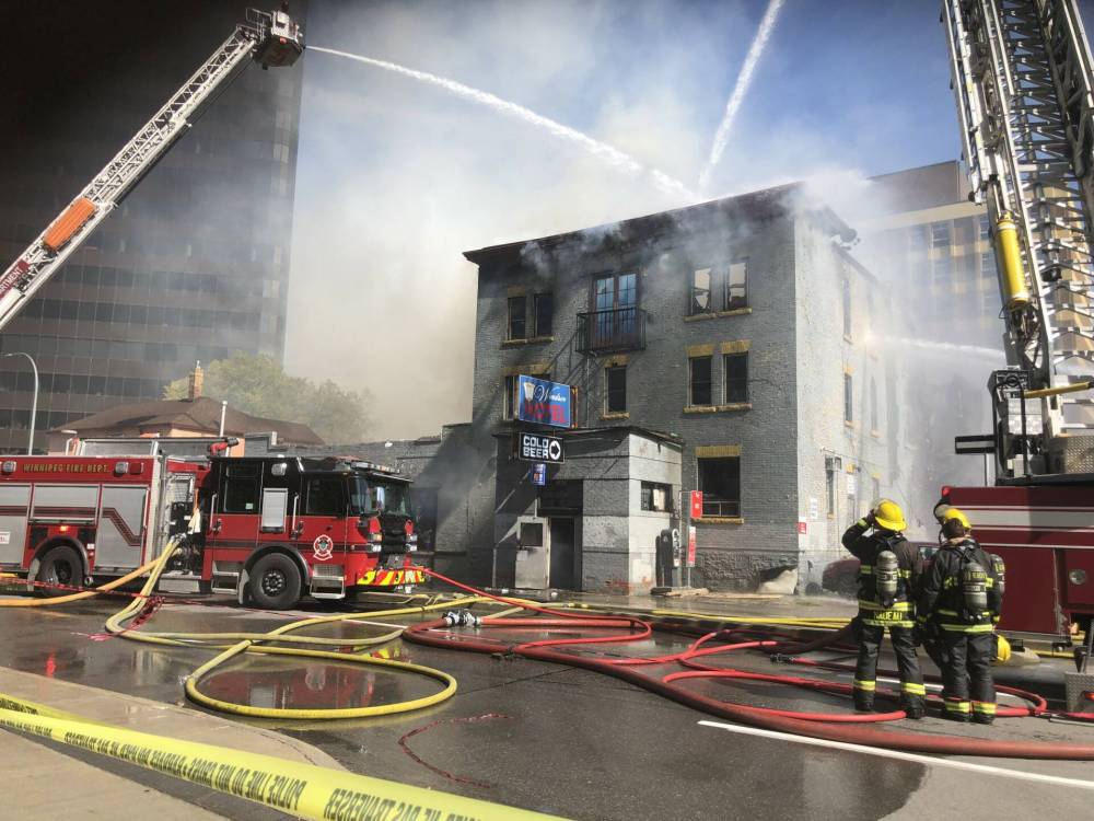 The former Windsor Hotel (187 Garry St.) caught fire around 10:50 a.m. Crews arrived to find heavy black smoke and flames billowing from the rear of the building, Winnipeg Fire Paramedic Service platoon chief Brent Cheater said.