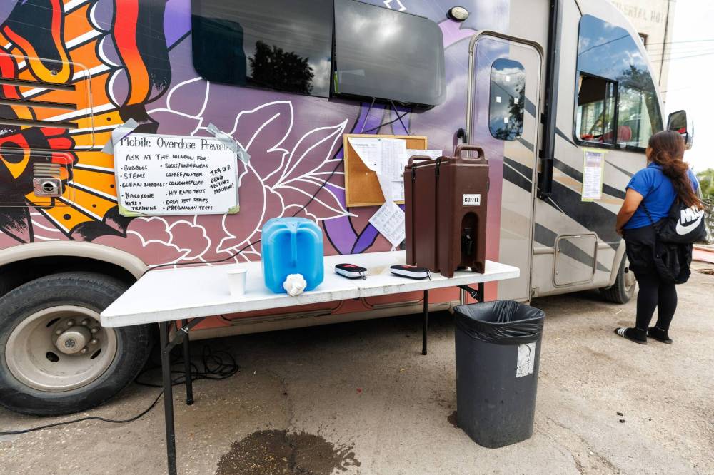 MIKE DEAL / WINNIPEG FREE PRESS FILES Coffee and Naloxone kits are free along with many other supplies to anyone who drops by at the Sunshine House RV or MOPS (Mobile Overdose Prevention Site) at the location in the parking lot of 631 Main Street.