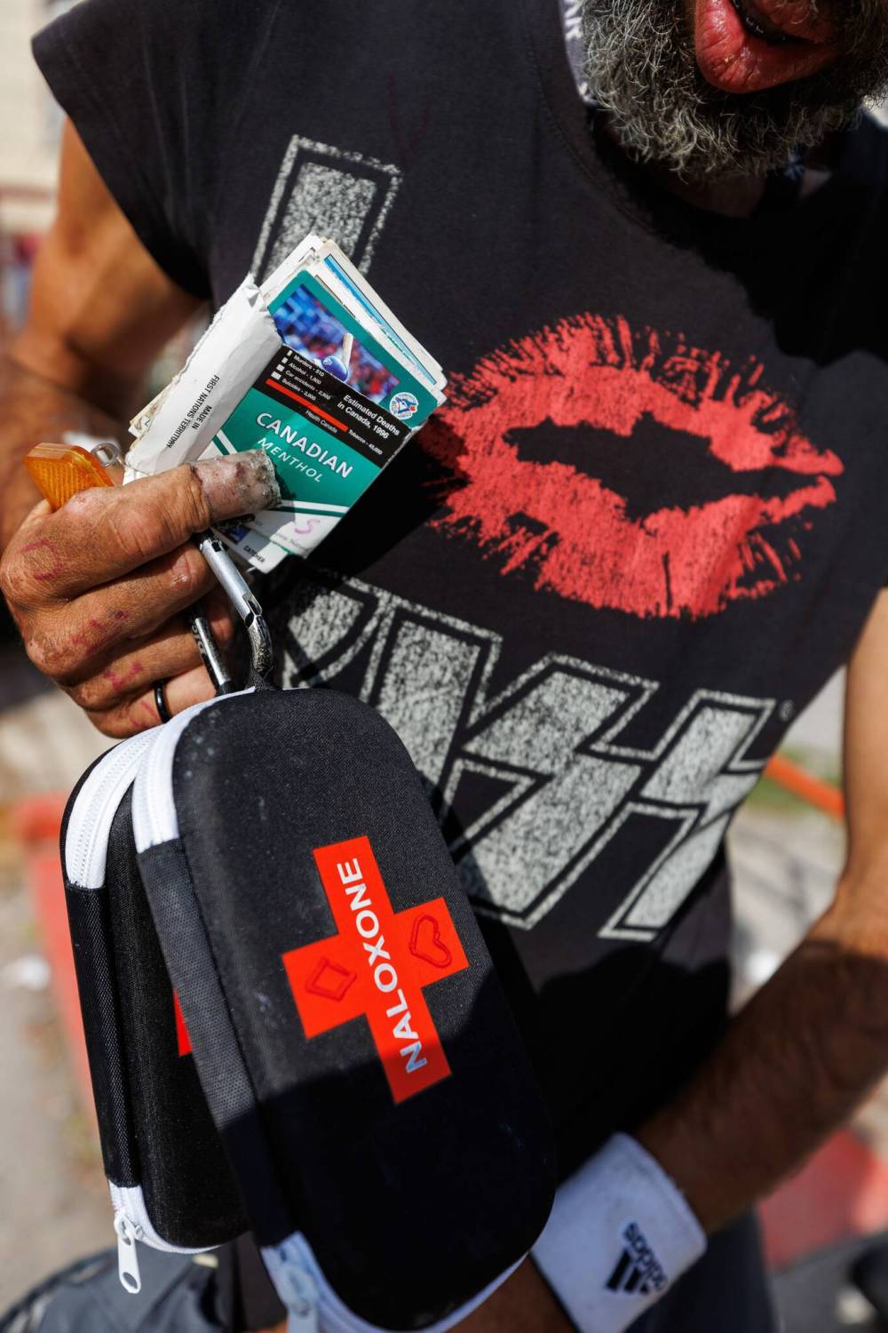 MIKE DEAL / WINNIPEG FREE PRESS FILES A participant with Naloxone kits and some baseball cards at Sunshine House RV or MOPS (Mobile Overdose Prevention Site).