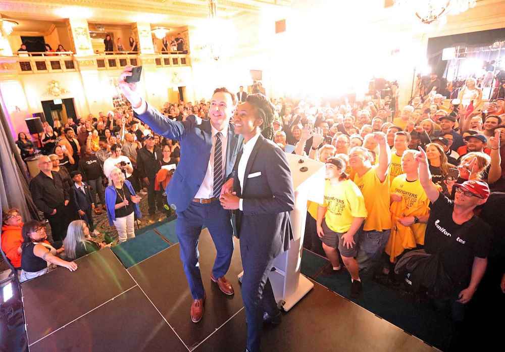 NDP MLAs Uzoma Asagwara and Adrien Sala snap a selfie as they wait for leader Wab Kinew to take the stage at the Fort Garry Hotel.