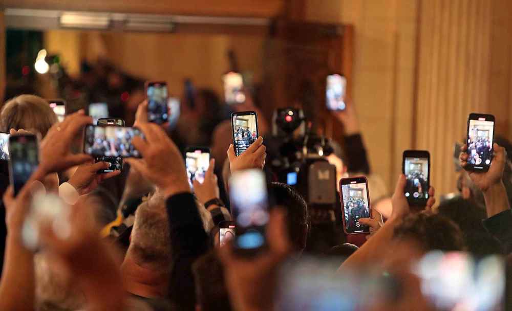 NDP hold up phones and cameras as leader Wab Kinew approaches the stage on Tuesday at the Fort Garry Hotel.