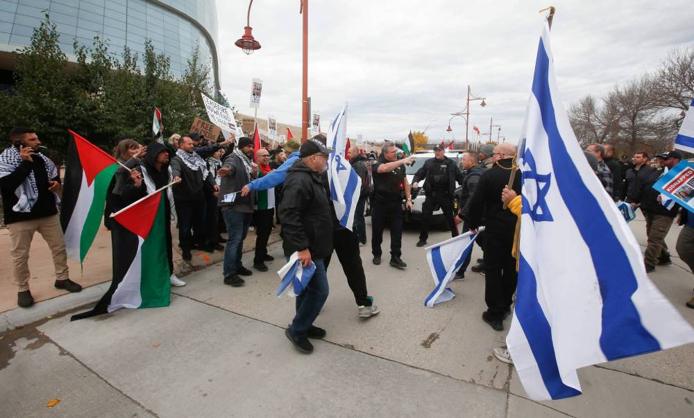 Police step in as Israeli supporters retrieve a flag taken by Palestinian supporters as both sides gather outside the Canadian Museum for Human Rights in Winnipeg on Sunday.