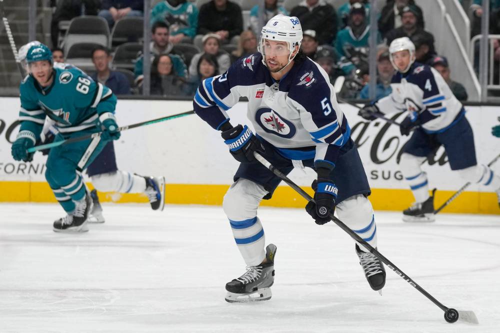 Winnipeg Jets defenceman Brenden Dillon looks to pass the puck against the San Jose Sharks during the first period. (AP Photo/Jeff Chiu)
