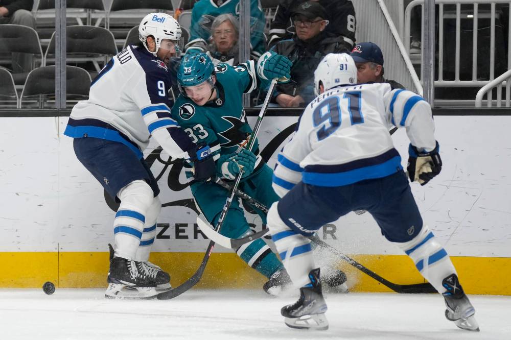 San Jose Sharks defenceman Calen Addison battles along the boards with Winnipeg Jets left wing Alex Iafallo and centre Cole Perfetti during the second period. (AP Photo/Jeff Chiu)