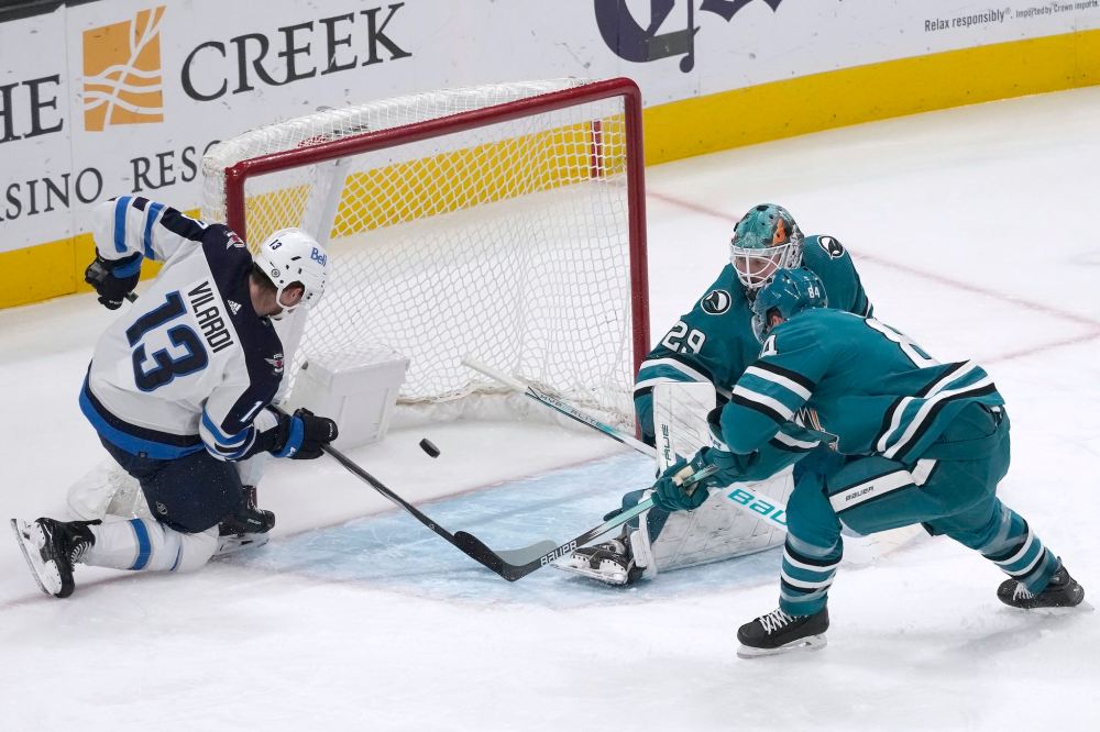 After some crisp puck movement in the offensive zone on a hooking penalty to Filip Zadina, Nikolaj Ehlers made a seam pass to Gabriel Vilardi for a backdoor tap-in that propelled the Jets to a 2-1 victory on Thursday night at SAP Center.