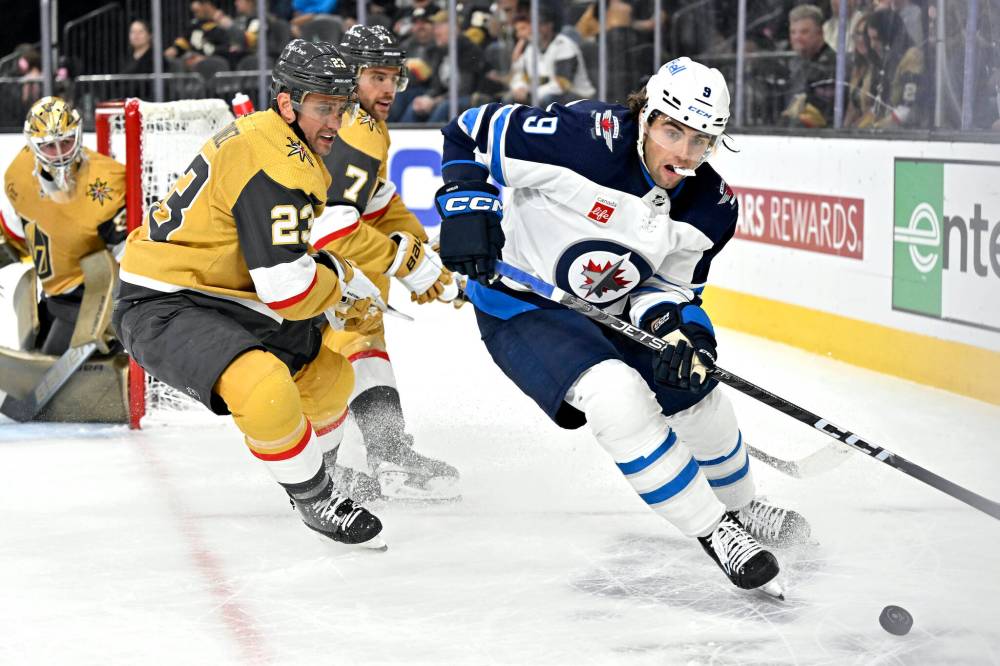 DAVID BECKER / THE ASSOCIATED PRESS FILES Winnipeg Jets left wing Alex Iafallo handles the puck against Vegas Golden Knights defencemen Alec Martinez and Alex Pietrangelo during an NHL hockey game Thursday, Nov. 2, 2023, in Las Vegas.