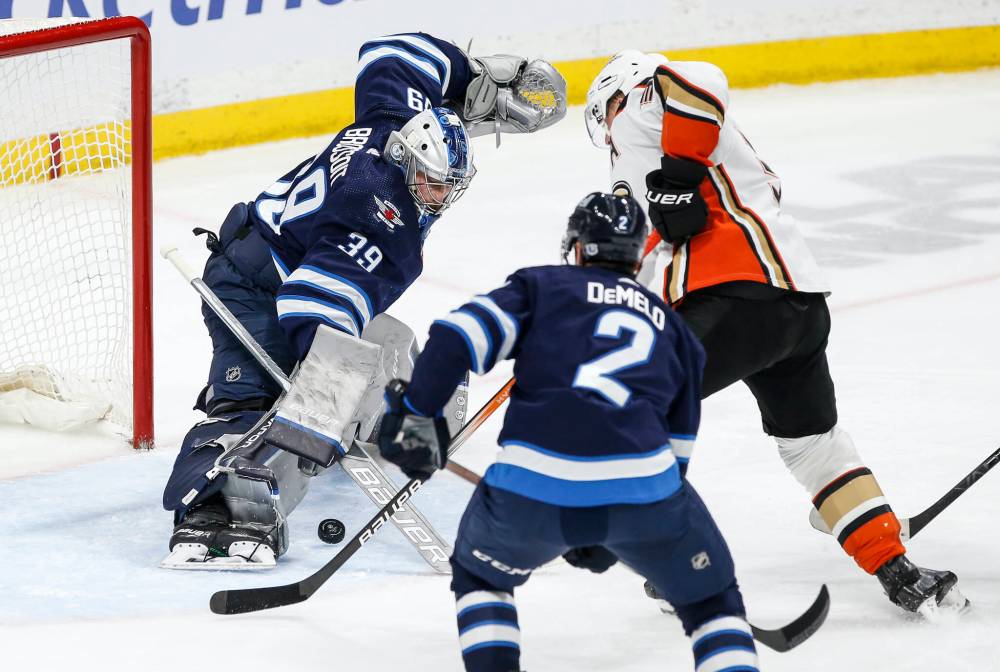 John Woods / THE CANADIAN PRESS Jets goaltender Laurent Brossoit stretches to make a save on Ducks forward Jakob Silfverberg as Jets blue-liner Dylan DeMelo closes in Friday night.