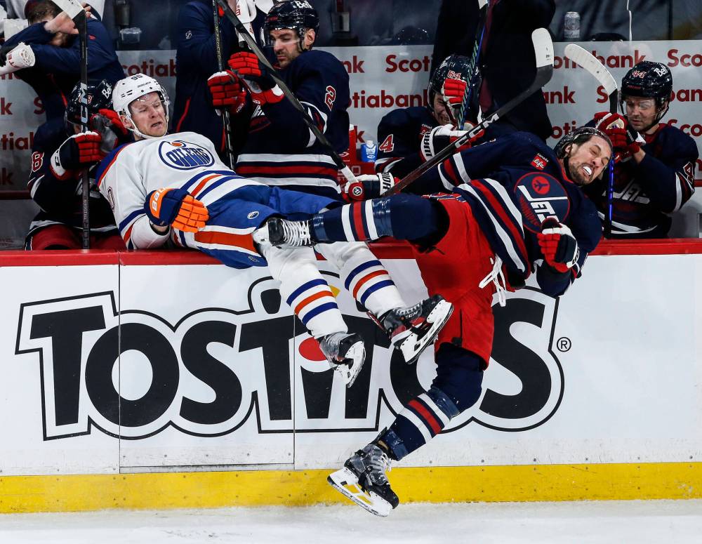John Woods / THE CANADIAN PRESS Jets blue-liner Brenden Dillon (right) sends Oilers forward Corey Perry into the Winnipeg bench with a thundering bodycheck Tuesday night.