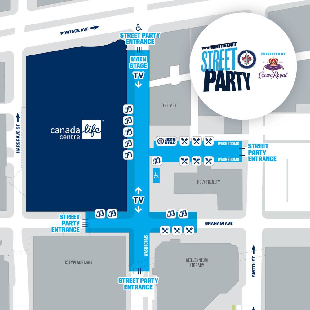 The Party in the Plaza will open three hours prior to puck drop, and the street parties will open two hours prior. The doors to Canada Life Centre will open 90 minutes ahead of each game.